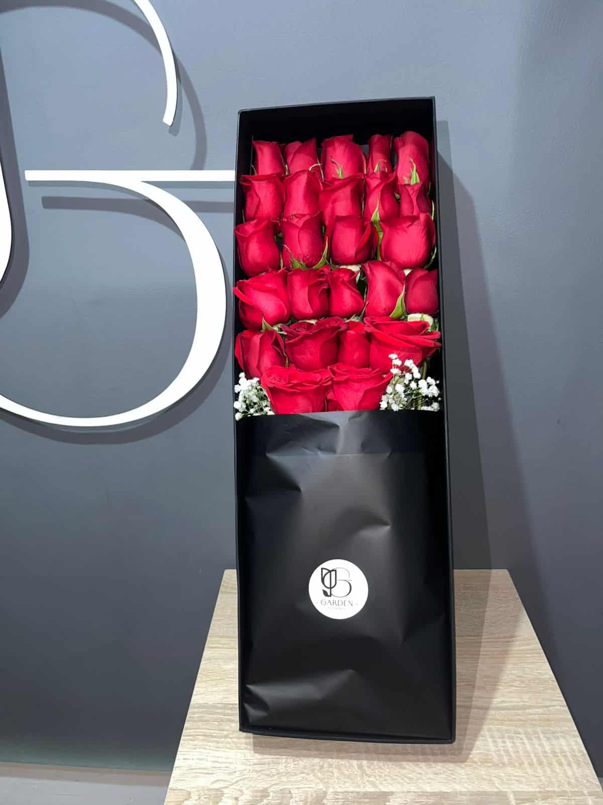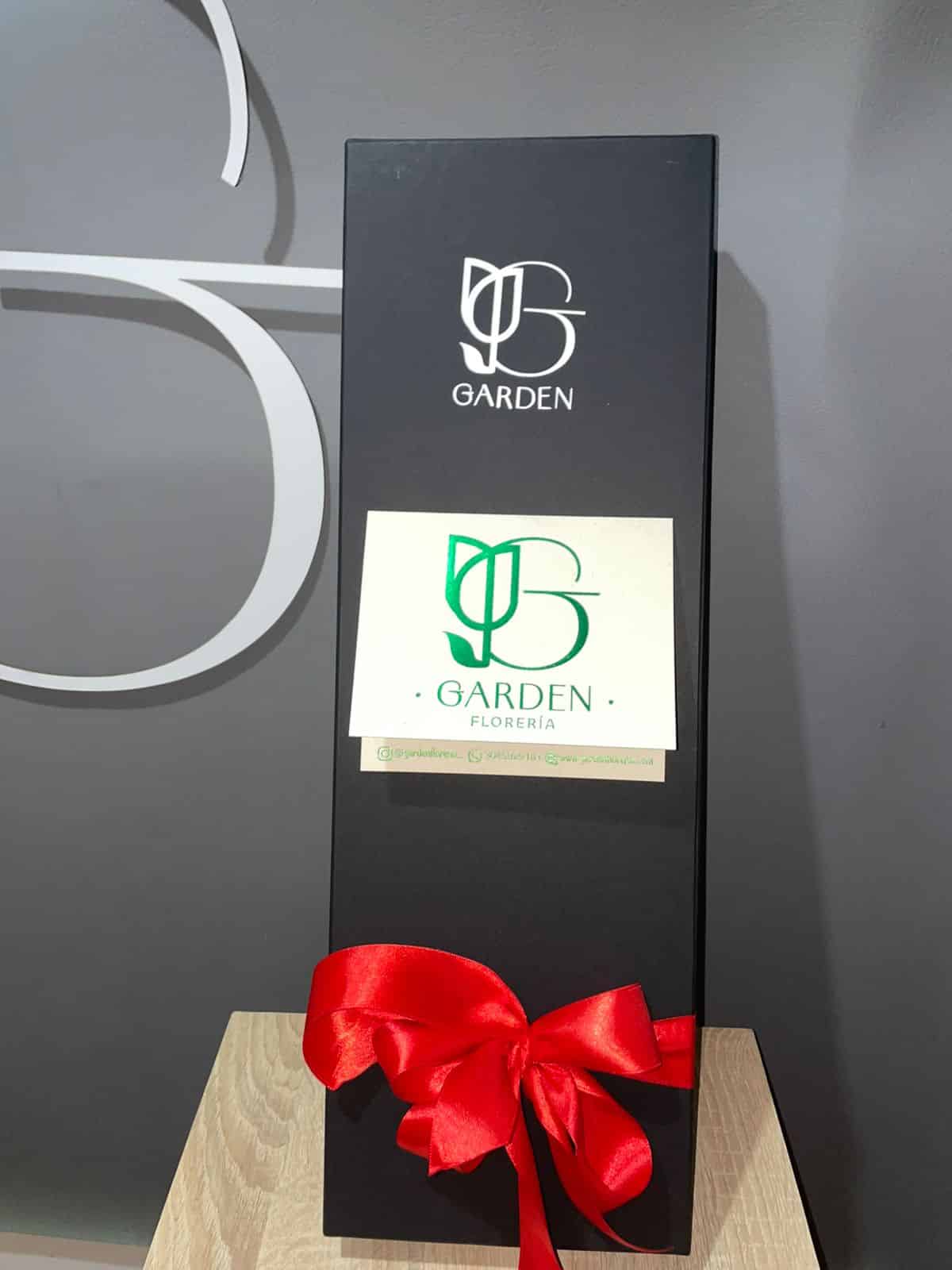 Caja de lujo negra en formato vertical, con elegantes rosas de exportación. Un detalle sofisticado que cautiva a primera vista.