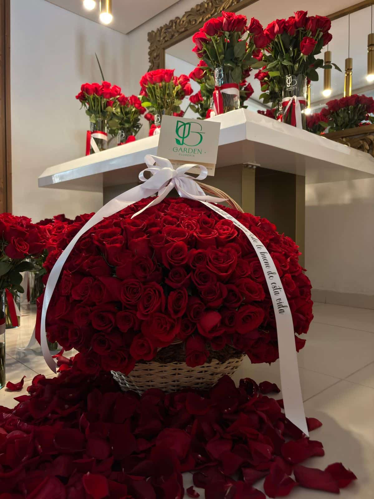 Hermosa canasta de lujo de 300 rosas tipo exportación con mensaje en cinta personalizada